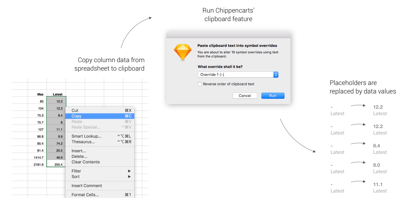 Simply copy your data into the clipboard, select the desired symbols in Sketch, Run Chippencharts > Paste clipboard text into symbols and voilà, your overrides should contain the data you copied. Note, this only works for symbols of the same kind.