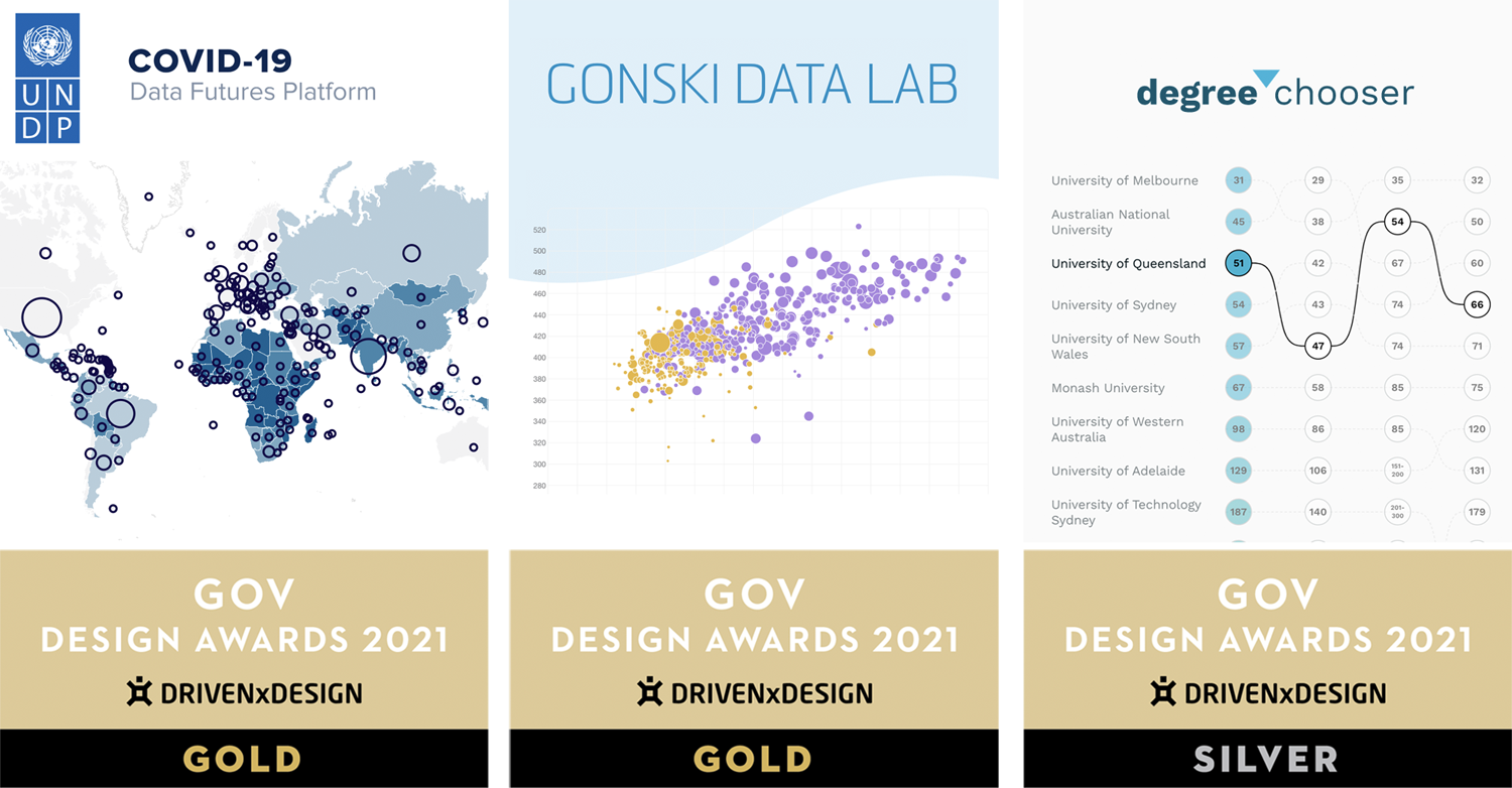 Our COVID-19 Data Futures Platform for the United Nations Development Programme won a gold GOV Design Award, as did the Gonski Data Lab, which we designed and built for the UNSW Gonski Institute for Education. Degree Chooser, created for Barlow Advisory and integrated into the University Admissions Centre website, took out a silver award. The GOV awards are organised annually by DRIVENxDESIGN (driven by design).