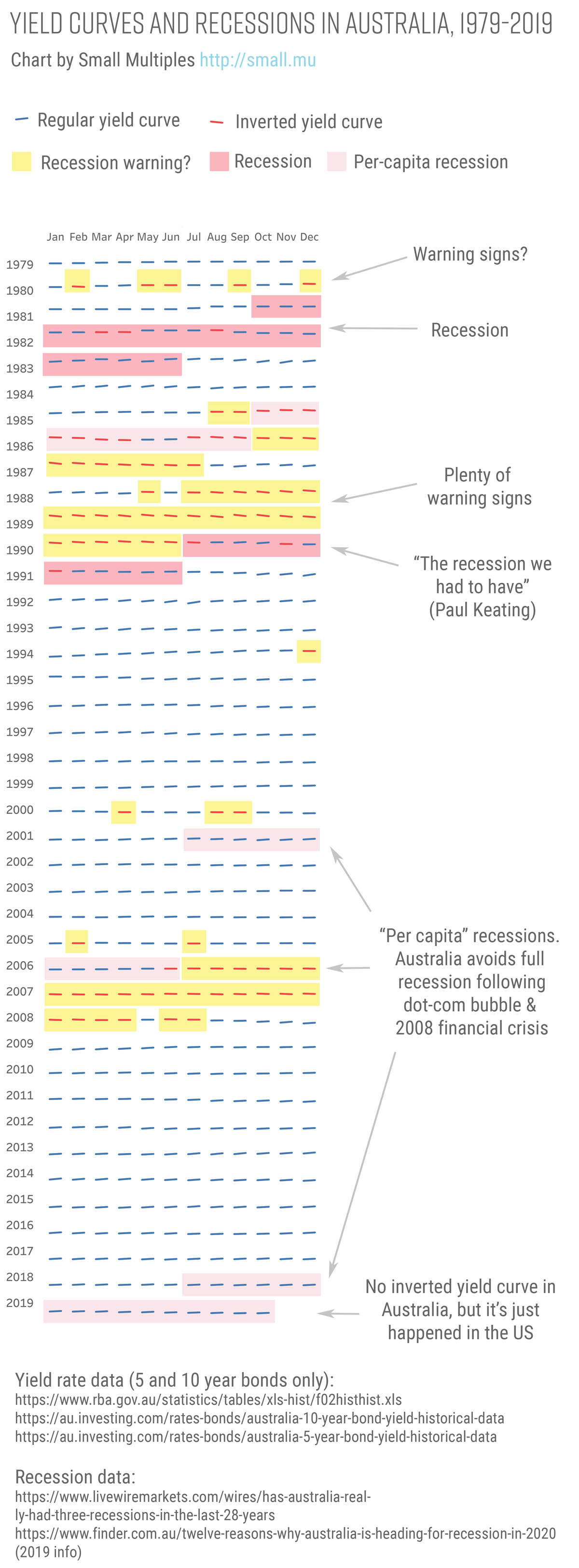 We recreated the chart with Australian data, to see what patterns we could make out. As you can see, it’s predicted all Australia’s recent recessions to some extent, but the latest per-capita recession is a bit of an exception.