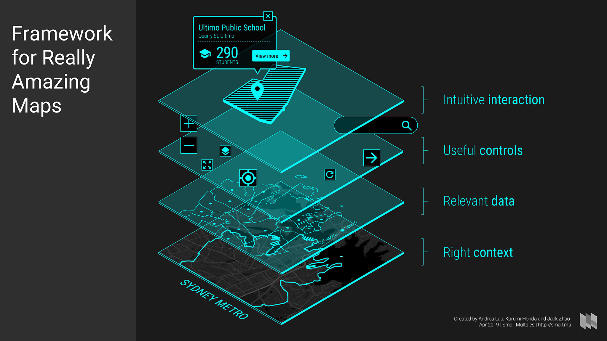At Small Multiples, we’ve been creating data visualisations for almost eight years, including over 60 maps. I put all of this knowledge together recently and gave a talk at Web Directions Design 2019 last week (12 Apr). The aim is to give designers the foundation to critique and create maps, turning them from generic maps to amazing ones.
