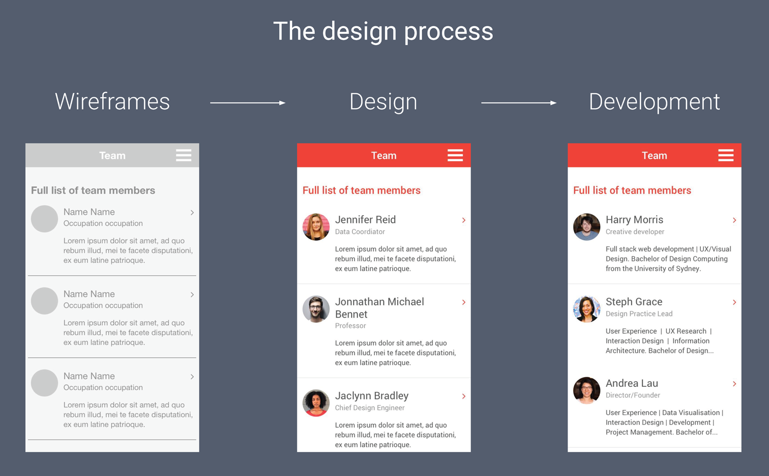 The first step in a regular design process is making the wireframes. In the first screen above, you can see the wireframe for a mobile application that includes a lot of placeholder elements - just ‘Name Name’ for the team member’s name, and Lorem Ipsum for the description.