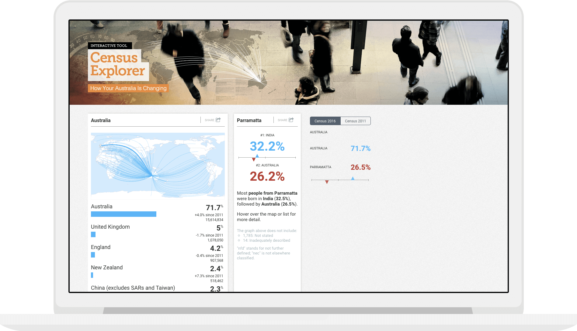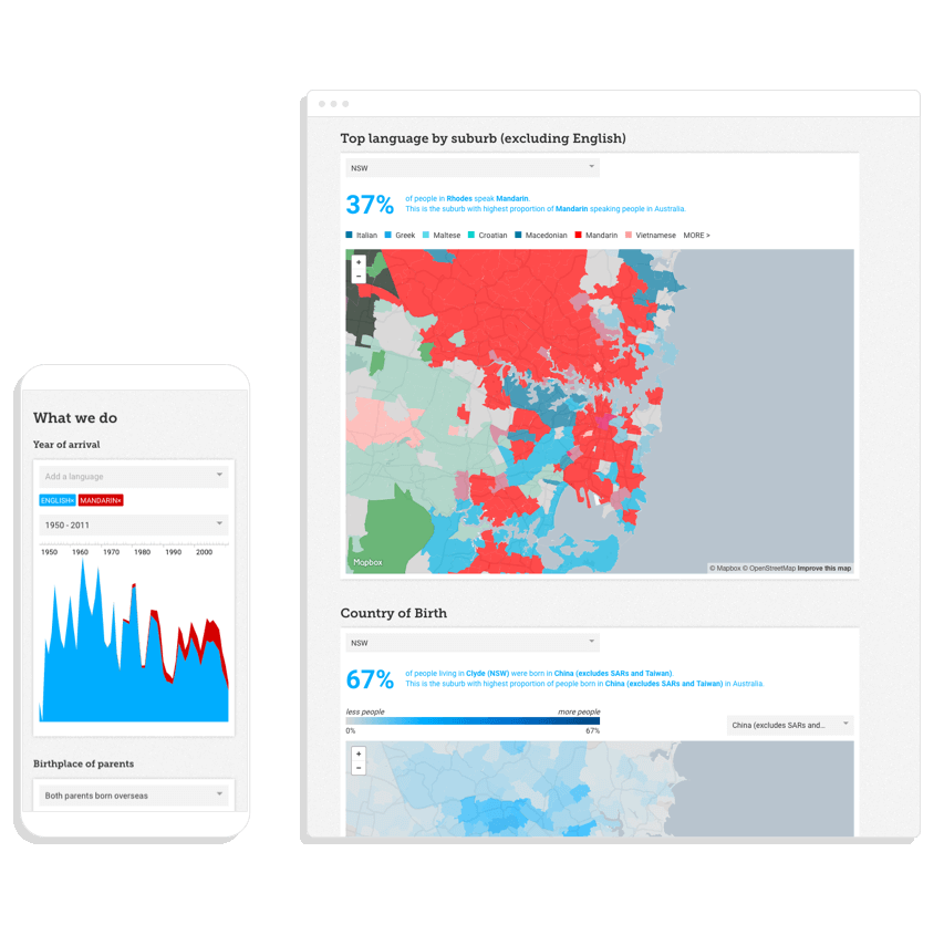 This project took the form of a data exploration tool visualising the key demographic indicators. The SBS Census Explorer is an accessible tool for learning more about who we are and where we’re heading as one of the most multicultural countries in the world.