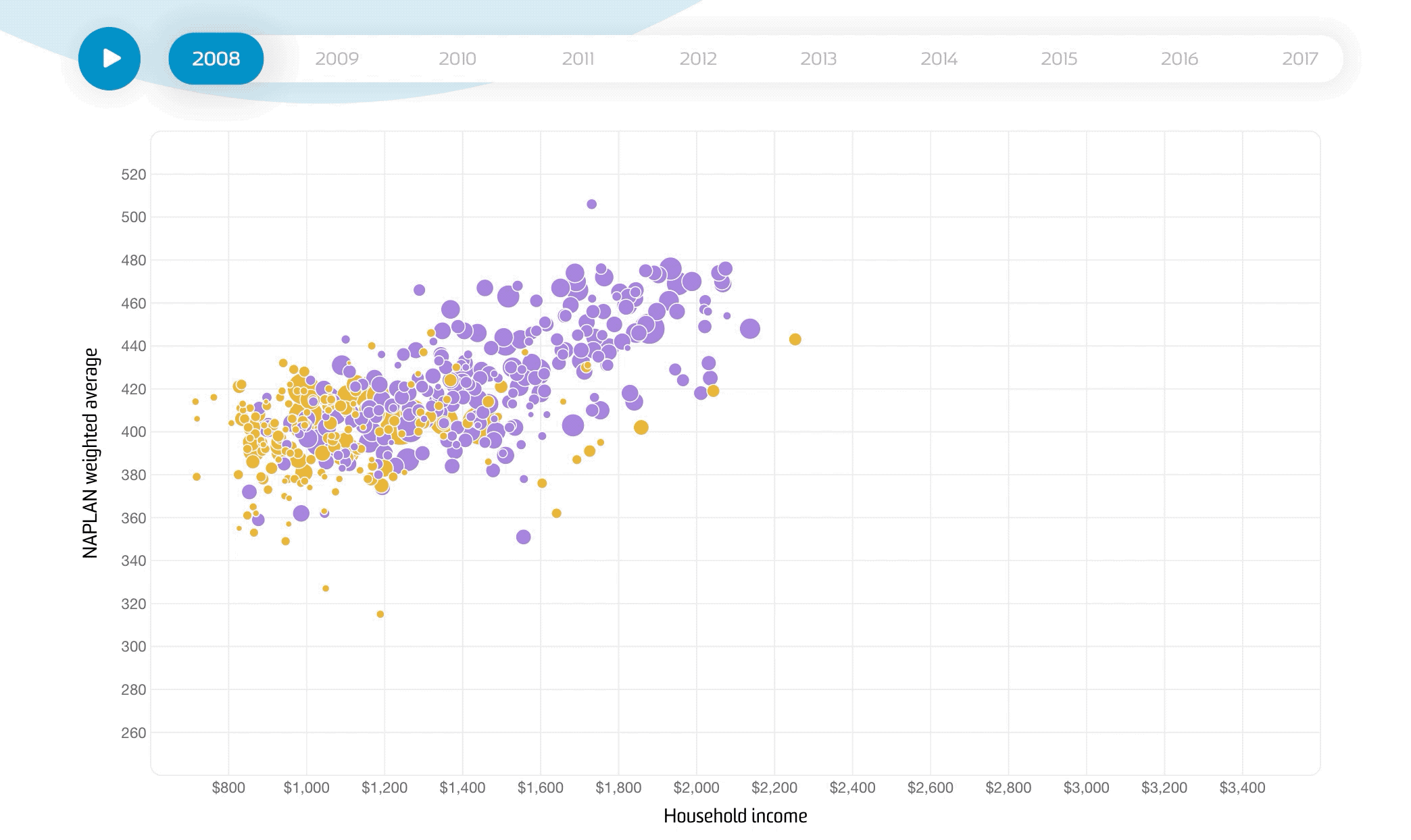 A ‘play’ feature allows you to see the interplay of these variables for each town or suburb between 2008 and 2017. Line graphs can be toggled on and off to see the course of this movement visualised.