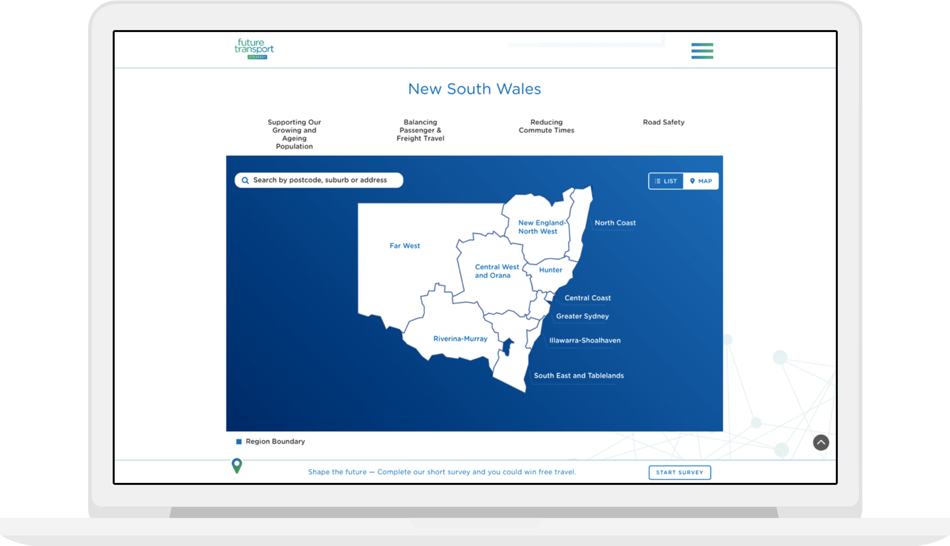 Create an interactive dashboard which visualises the unique Transport challenges that face each region in NSW, to be embedded within the new Future Transport website.