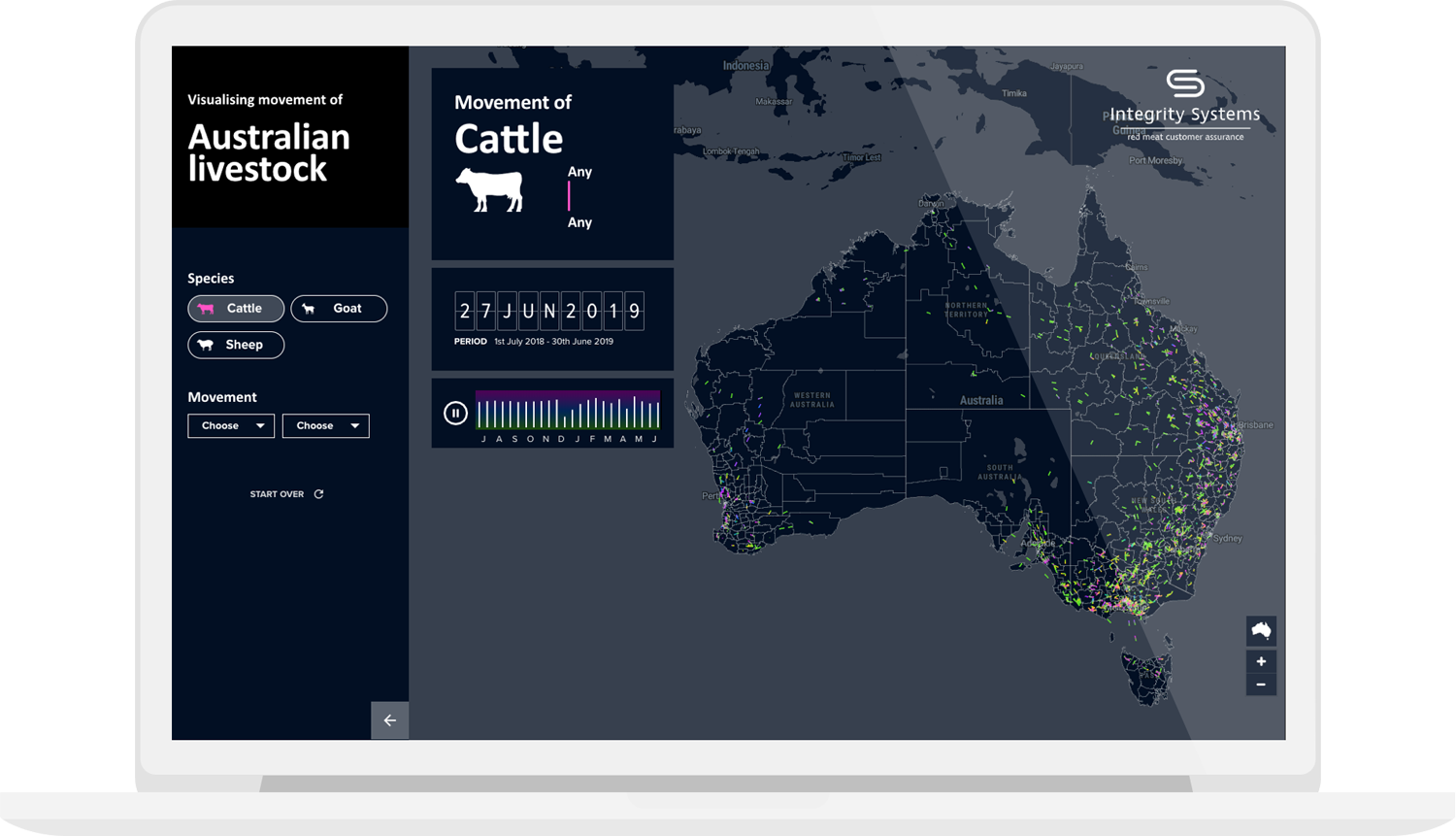 There’s security in this data - it can stop the spread of diseases and ensure product integrity across the entire industry. There’s also a lot of untapped value, for gaining insight into patterns of animal movement around the country, day-to-day reporting, presentations and publicity. Meat producers, industry partners, state authorities, Meat & Livestock Australia and many more stakeholders stood to benefit from better visualisations of NLIS data.